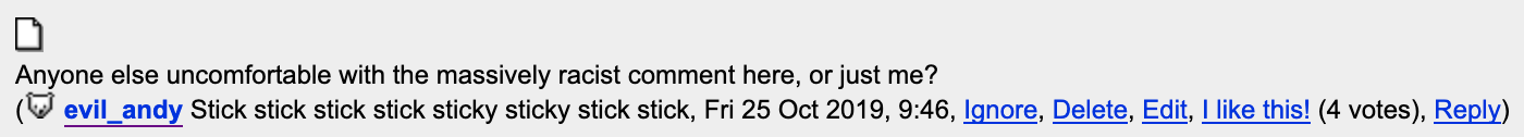 Anyone else uncomfortable with the massively racist comment here, or just me?